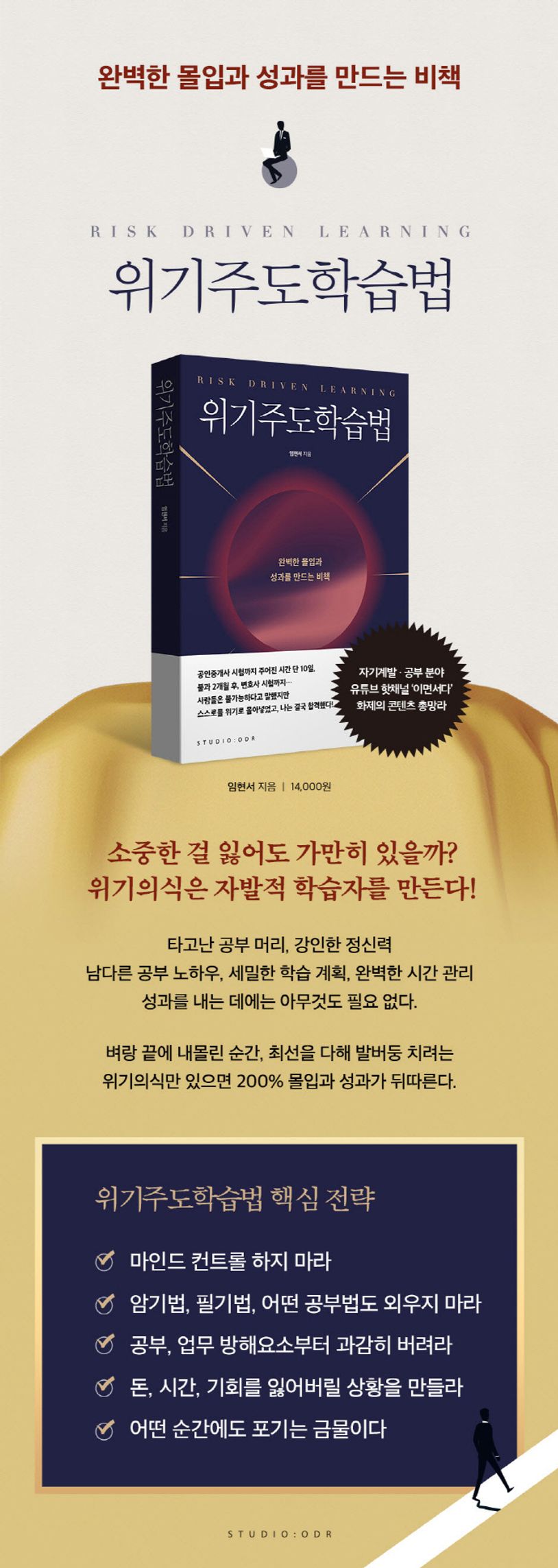 공부나 업무를 하려고 책상 앞에 앉으면 자꾸 딴짓하고 싶다. 그러다가 결국 데드라인에 임박해 쫓기듯 일을 처리하며 자책한다. 그러면서 한편으로는 1시간 공부하고 100시간 공부한 것과 같은 성과를 내고 싶다. 그런 마음으로 각종 공부법, 학습법, 몰입법에 대한 책을 들여다보지만, 그때뿐, 잘하지 못하는 현실은 나아지지 않는다. 《위기주도학습법》은 매번 유혹에 흔들리는 사람의 마음은 본능에 가까운 것이라고 깊이 공감하면서도, 마음먹기에만 의지해, 나에게 맞지 않은 옷과 같은 다른 공부법에만 의지해 상황을 모면하려는 태도를 지적한다. 그러면서 실질적으로 공부나 일을 많이 할 수 있는 환경, 그 환경 안에서 밀도 높게 몰입할 수 있는 방법으로 ‘위기’를 이용하라고 제안한다. 소중한 걸 잃을 수 있다는 심리 기제를 이용하면 그 어떤 방법론보다 성과를 내는 데 효과적이라는 것. 그 위기를 구체적으로 학습 과정에 어떻게 조성하고 이용할 수 있는지 서울대 로스쿨 출신 공부 프로 임현서가 자신의 경험담을 곁들여 이 책에 담았다.