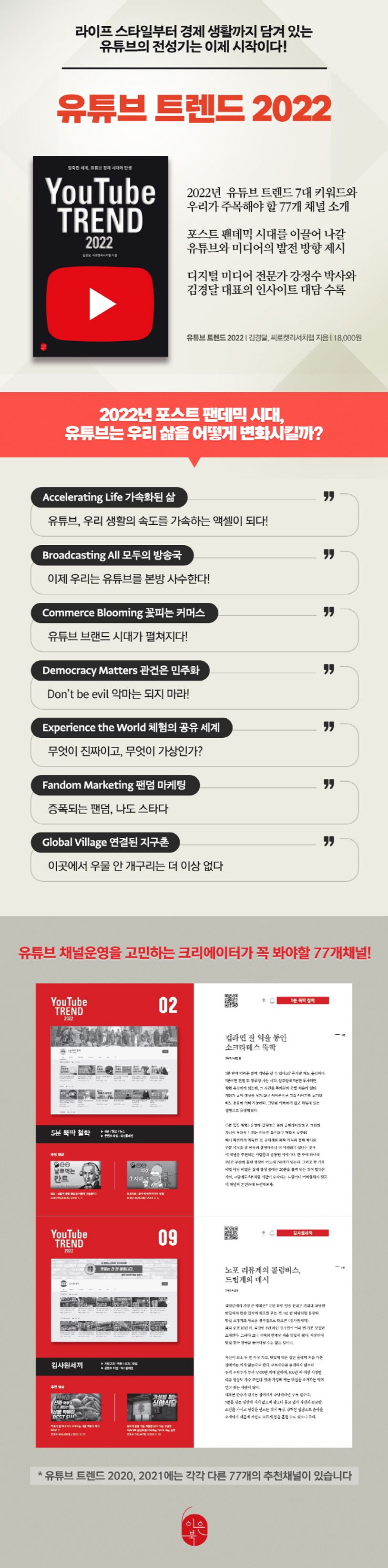 팬데믹으로 인해 사람들의 생활은 더욱 온라인화 되었다. 그 중심에 유튜브가 자리잡고 있다. 이제 모든 생활과 경제활동이 유튜브로 집중되고 있다. 유튜브 공간에서 새로운 기회를 찾고 싶은 기업과 브랜드, 유튜버들에게 「유튜브 트렌드 2022」는 좋은 트렌드 분석서 및 가이드북이 될 것이다.