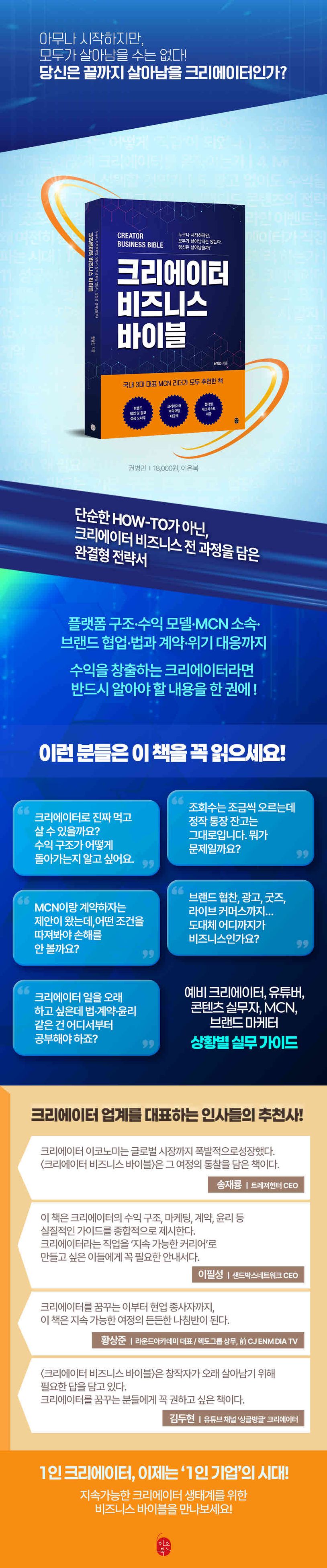 《크리에이터 비즈니스 바이블》은 바로 이러한 현실에서 출발한다. 콘텐츠 산업과 미디어 전략 분야에서 오랫동안 현장을 분석해 온 전략가로 꼽히는 저자가 크리에이터 비즈니스의 구조, 수익 모델, 플랫폼 운영, 법과 계약, 위기 대응까지 ‘1인 기업으로서의 크리에이터’가 반드시 알아야 할 실질적인 노하우를 총망라했다.