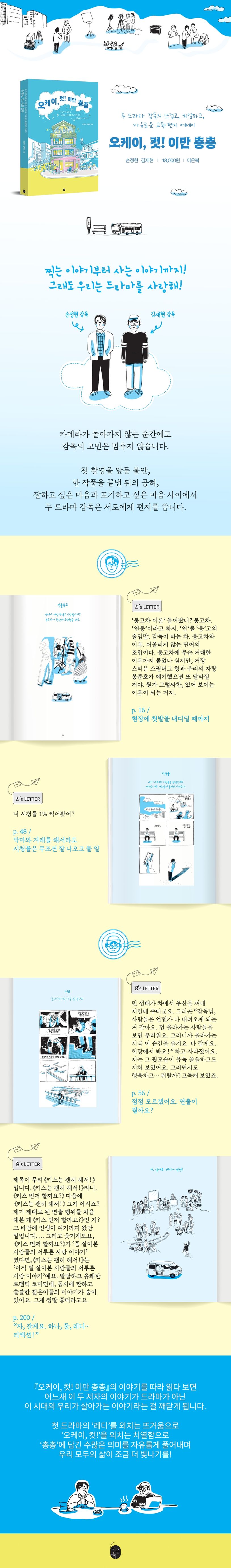 이 책 〈오케이 컷! 이만 총총〉은 SBS 드라마 PD 선후배인 손정현과 김재현의 편지글을 엮은 조금 독특한 에세이다.