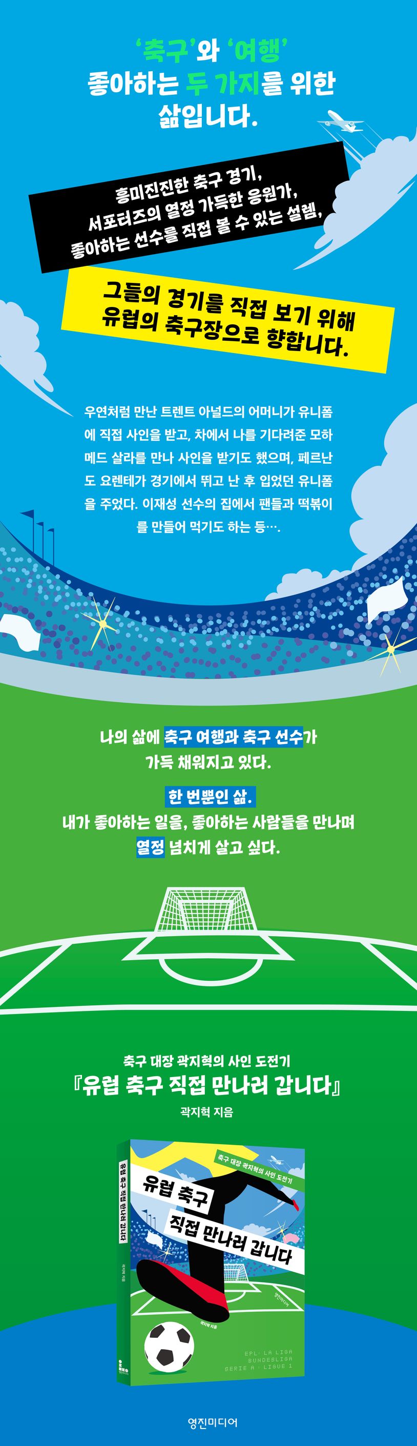 그런 그의 진심이 통해서였을까. 우연처럼 만난 트렌트 아널드의 어머니가 아들에게 가서 유니폼에 직접 사인을 받아다 주기도 했고, 모하메드 살라는 차에서 곽지혁을 기다려주기도 했다. 이 광경을 본 경비원은 “너 같은 럭키가이는 처음이야.”라고 할 정도이다. 저자가 가장 좋아하는 선수로 손꼽는 페르난도 요렌테와는 인스타그램으로 연락하는 사이가 되었고, 독일에서 활약 중인 이재성 선수의 집에서 팬들과 떡볶이를 먹기도 하는 등 상상도 못 했던 일이 그에게 펼쳐진다. 한 번뿐인 삶, 좋아하는 일을 하고 좋아하는 사람들을 만나며 열정 넘치게 사는 그의 삶으로 들어가보자.
