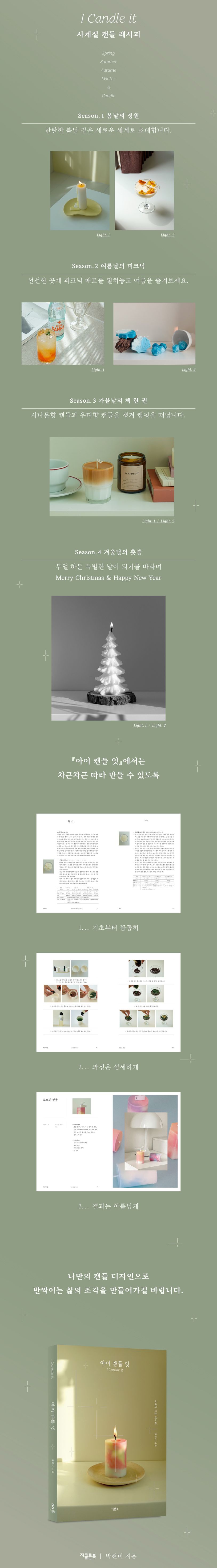 다채로운 색감, 감각적인 디자인, 다양하게 응용이 가능한 캔들 레시피를 소개한다. 국내외 수강생들로 문전성시를 이루는 캔들 공방 ‘아이캔들잇’의 캔들 레시피를 책으로 만나보자. 『아이 캔들 잇』에서는 봄, 여름, 가을, 겨울을 담았다. 계절적 특성을 살린 캔들을 소개하여 사계절 내내 다양하게 활용하도록 구성했다. 봄에는 플라워 캔들, 허브 캔들, 가드닝 캔들 등으로 설레는 봄날의 정원을 만들고 여름에는 조개 그라데이션 캔들, 아이스크림 캔들 등 여름 하면 연상되는 오브제의 캔들부터 젤 왁스를 활용한 투명한 에이드 캔들까지 선보인다. 가을에는 아늑한 가을의 모습을 닮은 컨테이너 캔들, 라떼 캔들, 구름 캔들을 만들며, 겨울날의 촛불에서는 눈꽃 캔들, 붕어빵 캔들, 스트로베리 케이크 캔들 등 즐거운 겨울의 모습을 담았다.