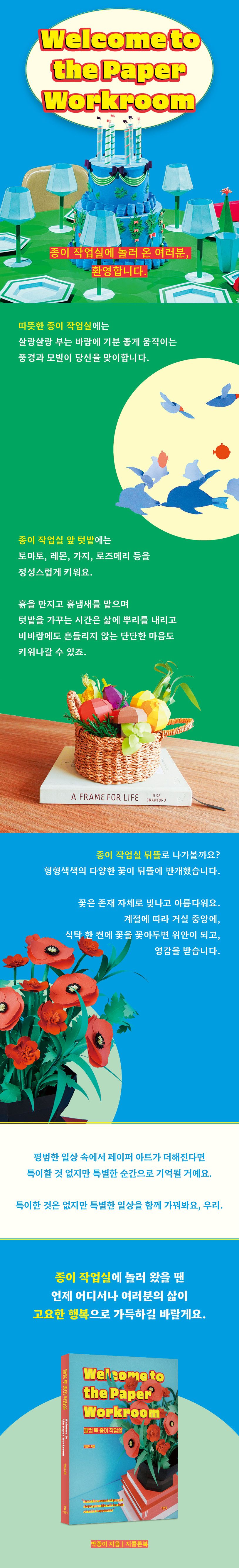 『웰컴 투 종이 작업실』에서는 페이퍼 아티스트 박종이 작가의 25가지 작품과 전개도를 만날 수 있다. 직접 전개도를 오리고 붙이며, 페이퍼 아트를 경험하게 된다. 평면인 종이가 입체가 되고, 공간이 되면서 새로운 세계가 펼쳐진다. 종이가 나지막이 속삭이는 사각사각 소리, 바라만 봐도 기분 좋은 꽉 찬 색감, 종이를 만질 때 느껴지는 따뜻한 촉감은 시간이 지날수록 페이퍼 아트의 매력에 빠지게 만든다.