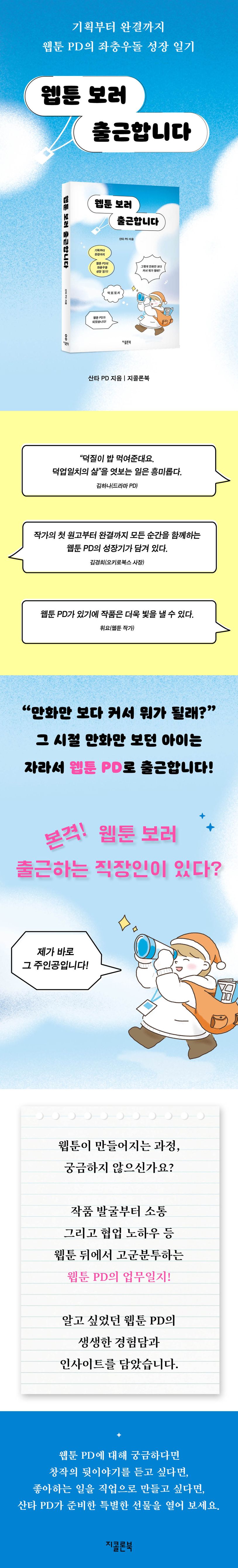 웹툰 PD라는 직업, 우리는 얼마나 알고 있을까? 작품을 발굴하고 작가와 협업하여 독자와 연결하는, 콘텐츠 제작의 모든 과정에 참여하는 직업이 바로 웹툰 PD이다. 『웹툰 보러 출근합니다』는 웹툰 PD라는 생소한 직업을 꿈꾸는 사람들, 웹툰의 탄생 과정을 알고 싶은 독자들, 그리고 좋아하는 일을 직업으로 삼고 싶은 모든 이들에게 영감을 전한다. 기획부터 협업과 웹툰의 완결까지 생생한 현장의 이야기를 담았다. 또한, 그 과정에서 겪는 고민과 성장이 진솔하게 드러난다.