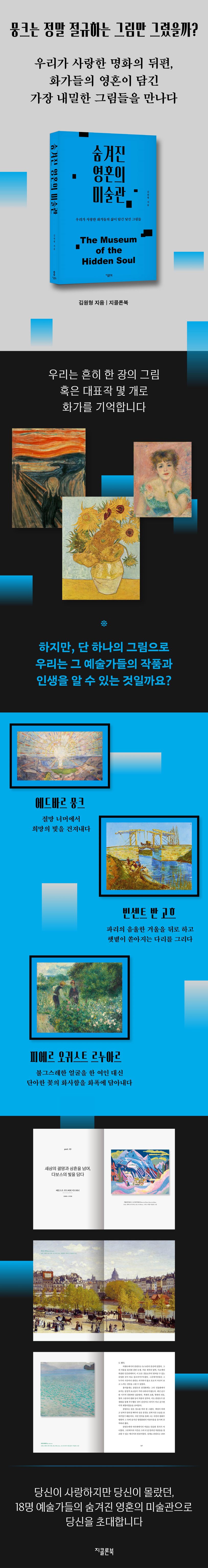 『숨겨진 영혼의 미술관』은 화려한 명성 뒤에 가려진, 거장 18명의 낯설고도 사적인 그림들을 꺼내어 보인다. 죽음의 공포에 떨던 뭉크가 말년에 그린 눈부신 ‘태양’, 화려한 파리의 화가 마네가 비난을 피해 도망친 바닷가에서 그린 ‘소박한 해변’, 연인들의 아름다운 순간 대신 사람 하나 없는 ‘고요한 자연’을 담아낸 클림트까지. 대표작들의 명성 뒤에 가려진, 또 다른 걸작들을 마주하다 보면 알고 있다고만 생각했던 예술가들의 숨겨진 영혼을 마주하게 될 것이다.
