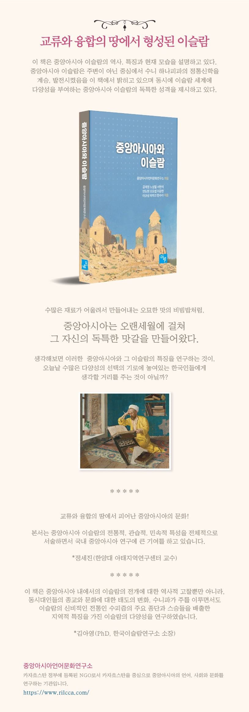 이 책은 중앙아시아 이슬람의 역사, 특징과 현재 모습을 설명하고 있다. 그동안 이슬람교를 연구할 때에 ‘중앙아시아 이슬람’에 대해서 평가절하하는 경우가 많았다. 그러나 중앙아시아 이슬람은 주변이 아닌 중심에서 수니 하나피파의 정통신학을 계승, 발전시켰음을 이 책에서 밝히고 있으며 동시에 이슬람 세계에 다양성을 부여하는 중앙아시아 이슬람의 독특한 성격을 제시하고 있다.