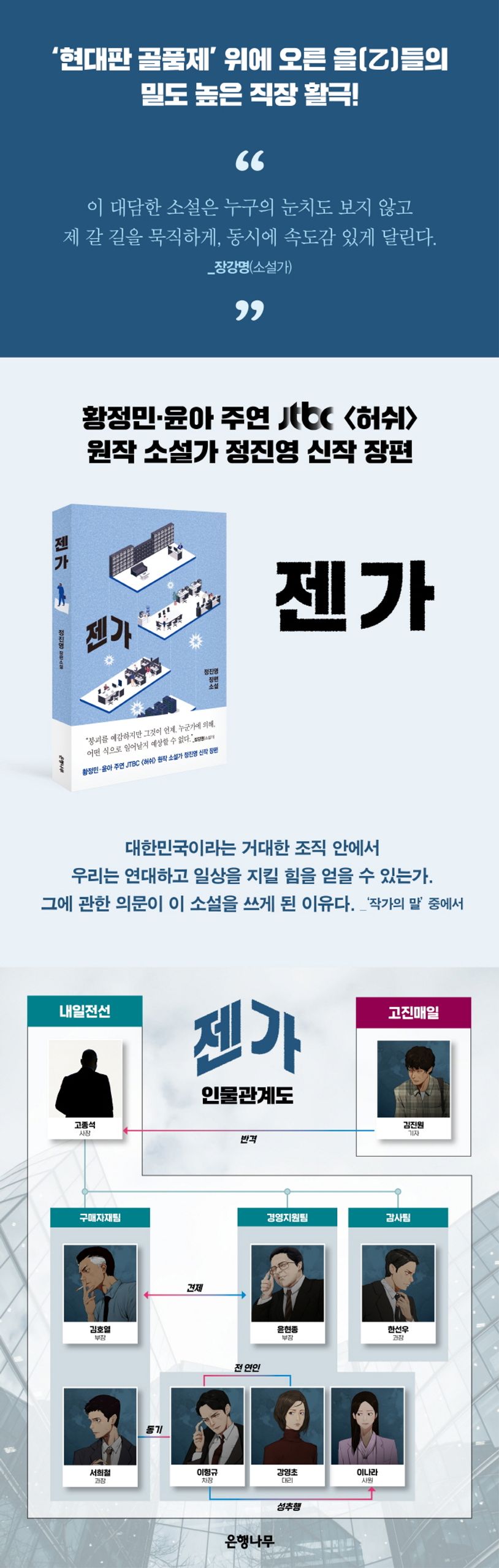 소설가장강명은《젠가》를두고“누구의눈치도보지않고제갈길을묵직하게,동시에속도감있게달”리는소설이라고말하며“마지막페이지까지긴장감을잃지않”고“한회사,한도시,결국에는한국사회를뒤덮은부조리를정밀하게고발한다”라고평했다.‘고진순혈주의’를표방하며지연과학연으로세워진자신만의성을지키려는고종석사장,신입사원이나라를성추행한뒤“키스한것은맞지만강제는아니라”며재기를노리는나오는이형규차장,전연인이형규에대한복수심에그가이나라에게강제키스하는장면을촬영한뒤사내채팅방에올려버린강영초대리,그런강영초의행동을용기있다치켜세우면서도승진을가장해좌천시켜버리는인사팀,횡령정황이드러났음에도불구하고적반하장으로나오는서희철과장…….정진영은이렇듯인간의욕망에서발아한온갖부조리들을‘고진시’라는가상의도시에부려놓고‘현대판골품제’위에오른을(乙)들의밀도높은직장활극을완성했다.