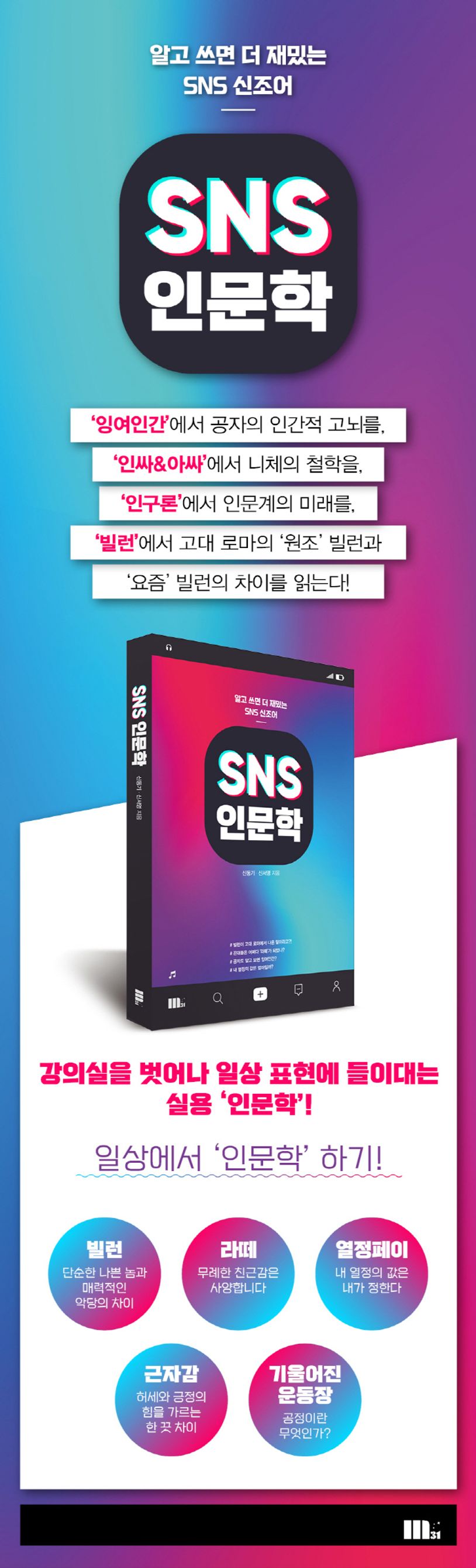 ‘인기 많은 친구’ 혹은 ‘인사이더’보다는 ‘인싸’가, 그냥 ‘인싸’보다는 ‘핵인싸’가 훨씬 더 직관적이고 귀에 쏙쏙 박힌다. ‘흙수저’, ‘잉여인간’, ‘아빠 찬스’ 등도 마찬가지다. 누가 만든 말인지 그야말로 센스가 넘친다. 그래서일까. 어느덧 이런 신조어들이 SNS를 넘어 방송, 언론계까지 진출해 있다. 신조어는 인터넷 밈의 일종으로 대개 빠르게 생성되고 소멸되지만 개중에는 꽤 오랫동안 생명력을 유지하는 것들도 있다. 그리고 그 생명력에는 나름의 이유가 있을 것이다. 이 책은 우리 시대에 꽤 오랜 생명력을 유지하는 신조어들을 선별해 그 표현 밑에 잠겨 있는 배경과 깊이를 가볍게 따져본다. ‘잉여인간’에서 공자의 인간적 면모를, ‘인싸&아싸’에서 공자와 맹자, 니체의 철학을, ‘라떼’에서 세대 간 갈등의 근본 이유를, ‘빌런’에서 고대 로마의 ‘원조’ 빌런과 ‘요즘’ 빌런의 차이를 확인해보자.
