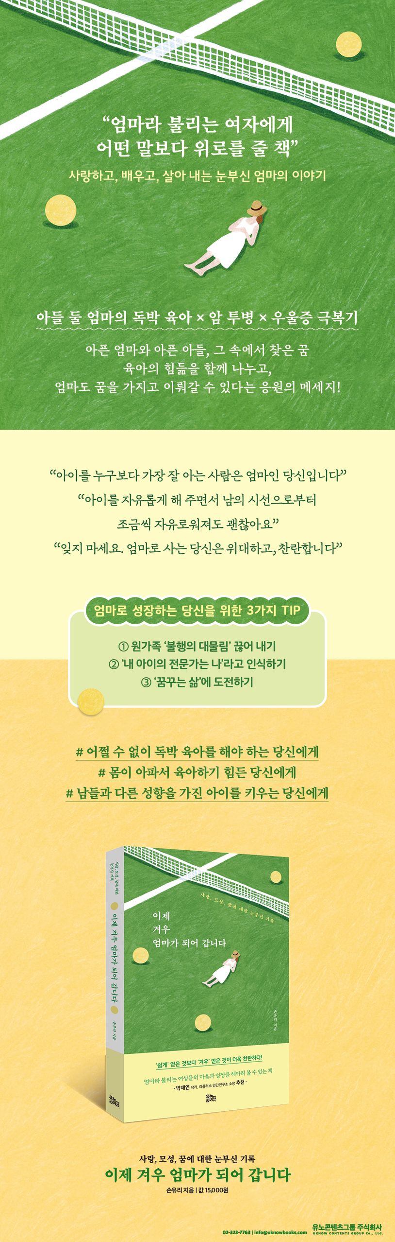 ‘이제야 엄마가 되었다’는 고백을 하기까지 저자의 삶은 순탄치 않았다. 4킬로그램 우량아 아들을 출산하고, 이어진 갑상선암 수술, 독박 육아, 육아 우울증, 아들의 틱 장애까지. 몸과 마음은 부서질 듯 아팠고, 엄마가 아프니 아이도 덩달아 아팠다. 혼자서 아이를 돌봐야 하는 순간도, 수술 후유증으로 피곤함을 달고 살았던 순간도, 어디를 가든 문제를 일으키는 아들 때문에 수습해야 하는 순간도 눈물겨운 좌절이 따라다녔다.