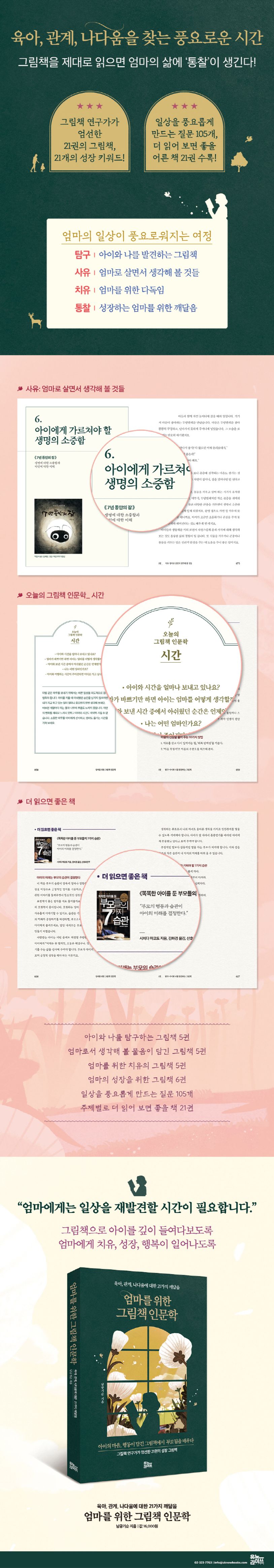 아이를 어떻게 대할 줄 몰라서 육아가 힘겨울 때, 그림책으로 아이의 세계를 발견하면서 넓은 시선으로 부모의 가치를 깨닫는 것, 그림책 연구가가 《엄마를 위한 그림책 인문학》에 21권의 그림책을 소개한 이유이자 이 책의 가치다.