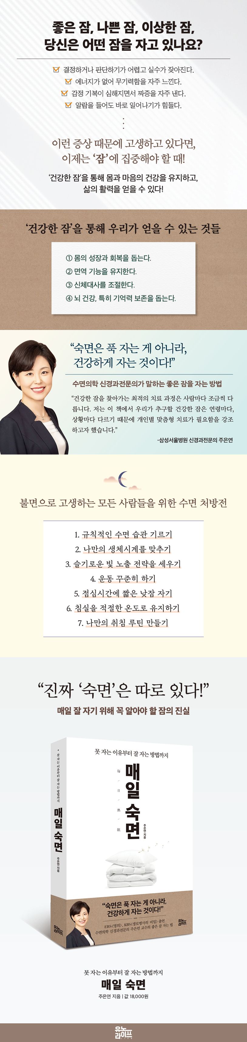 《매일 숙면》은 20여 년 동안 2만 명 이상의 수면장애 환자들을 치료한 저자의 경험을 녹여낸 책이다. 불면증, 수면호흡장애, 렘수면 행동장애, 하지불안증후군 등 우리가 잠들지 못하는 이유부터 잘 자는 방법까지 책 한 권에 모두 모았다. 다양한 자료와 실제 환자 사례를 활용하여 생애주기별 수면 특징까지 자세하게 설명해 준다.