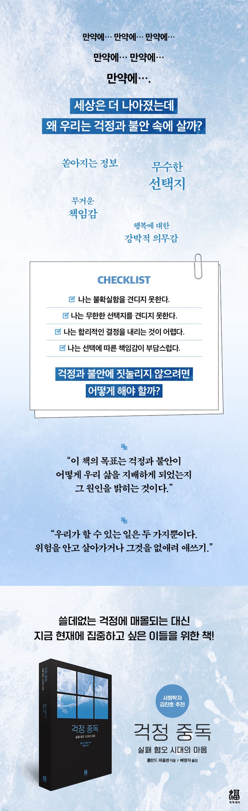 『걱정 중독』은 걱정과 불안이 우리 삶을 지배하게 된 과정을 좇으며, 인간이 어떻게 자신의 생각과 감정에 이토록 골몰하게 되었는지 문화와 역사를 넘나들며 살펴본다. 사회학자 롤란드 파울센은 수많은 통계와 연구자료 뒤편에 실제로 존재하는 사람들을 직접 만나 그들의 생생하고도 구체적인 목소리를 기록하고자 했다. 언제나 최악을 상상하는 ‘평범한’ 사람들, 현대인의 머릿속에 과연 무슨 일이 벌어진 걸까?