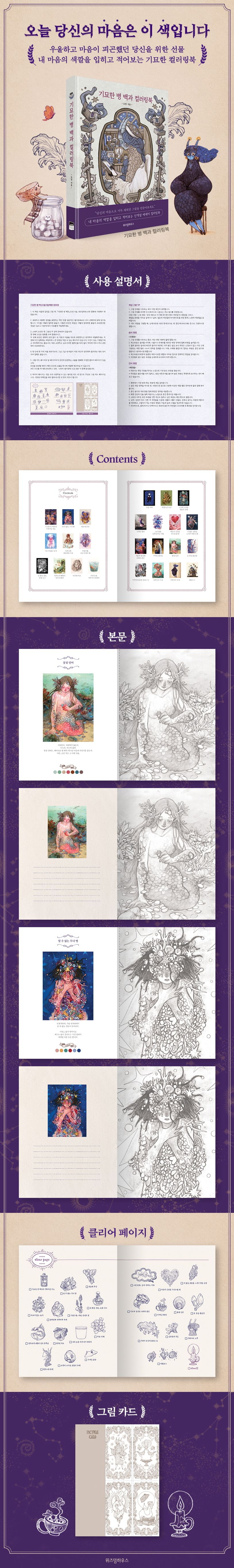 『기묘한 병 백과 컬러링북』은 112페이지 분량으로 제작되어 기존 『기묘한 병 백과』에 공개되지 않은 신작이 추가되었다. 각 원화의 스케치 도안은 두 장씩 들어 있어 어둡고 마이너한 감성을 담은 원화대로 색을 입히고, 내 마음이 가는 대로 한 번 더 색칠할 수 있다. 색을 입히는 동안 차분하게 내 마음을 돌아보고 정리된 마음을 적어볼 수 있는 페이지도 더해졌다. 도안을 완성할 때마다 하나씩 칠하는 ‘클리어 페이지’와, 미니 엽서 등 다양하게 활용할 수 있는 그림 카드 페이지는 컬러링북의 새로운 재미를 선물한다. 도안을 완성할 때마다 클리어 페이지를 칠하면 나의 마음으로 가득 채워진 나만의 작품집이 완성될 것이다.