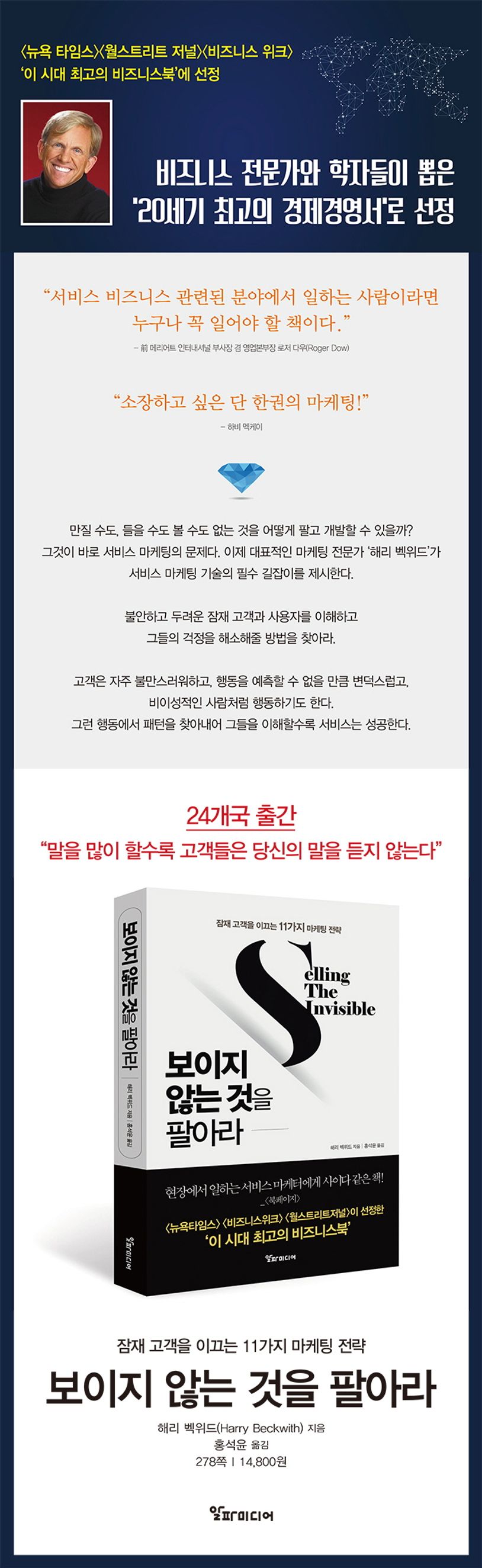 《보이지 않는 것을 팔아라》는 이미 출간된 지 20년이 넘은 스테디셀러다. 그러나 출간된 이후 변치 않는 베스트셀러로, 각종 비즈니스북 순위권에 들어 있다. 또한 〈뉴욕타임스〉 〈비즈니스위크〉 〈월스트리트저널〉 등 저명한 언론 매체에서 ‘이 시대 최고의 비즈니스북’으로 선정할 만큼, 시대를 넘어선 놀라운 통찰을 담고 있다. 그러므로 서비스 마케터뿐만 아니라 기업의 CEO와 COO를 비롯하여, 비즈니스에 몸담은 사람이라면 누구나 깨달음과 구체적인 실행 방안을 수십 개는 찾을 수 있다.