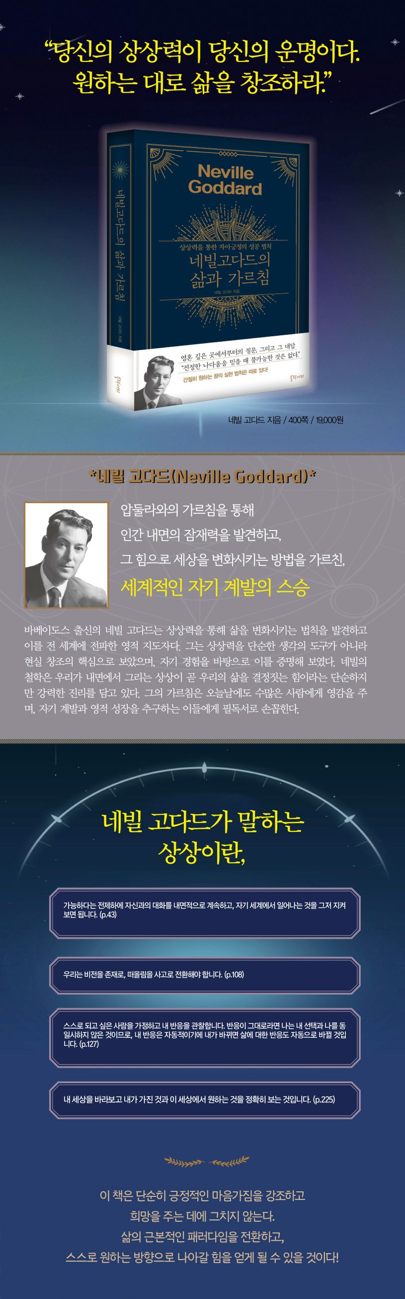 이러한 네빌 고다드의 강연과 저술을 토대로, 그의 철학적 통찰과 실천적 접근 방식을 체계적으로 정리했다. 독자들은 압둘라와의 특별한 스승-제자 관계를 비롯해, 네빌 고다드가 삶에서 실현한 꿈과 현실 변화를 경험하며 배운 교훈을 만나볼 수 있다. 상상력을 통해 자신을 재발견하고, 꿈을 구체적 현실로 전환하는 데 필요한 실질적 지침을 독자들에게 제공한다.