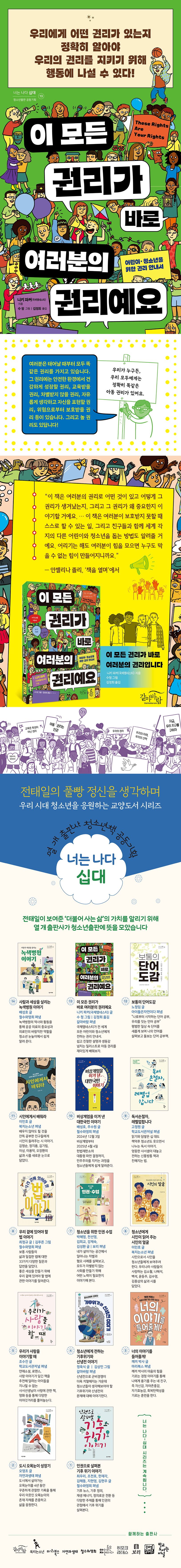 또한 권리가 침해되었을 때 스스로 할 수 있는 일, 친구들과 함께 세계 각지의 다른 어린이와 청소년을 돕는 방법도 알려준다. 그리고 세계 곳곳에서 용기 있게 행동한 어린이와 청소년의 실제 이야기를 들려줌으로써 독자들에게 ‘나도 세상을 바꿀 수 있다’는 자신감과 용기를 전한다. 이 책은 어린이와 청소년이 자신의 권리를 이해하고 스스로 지켜나갈 수 있도록 돕는 한편, 어른들에게도 인권 교육의 중요성을 일깨워주는 소중한 인권 교과서이다.