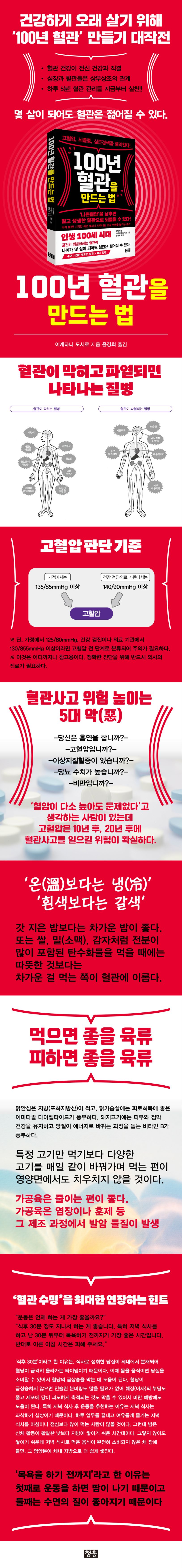 건강한 100세를 목표로 하는 사람, 100세까지 살기에는 몸이 좀 불안한 사람에게도 저자가 권하고 싶은 것이 있다. 바로 100년은 거뜬할 수 있도록 혈관을 건강하게 만드는 것이다. 다시 말해, ‘100년 혈관’을 만드는 법이다. 혈관을 젊게 유지할 수 있으면 누구나 건강한 100세라는 희망에 가까이 다가갈 수 있으며, 오래 살면 살수록 생길 수밖에 없는 건강에 대한 불안도 해소될 것이다. 왜냐면 ‘혈관 건강’이 ‘전신 건강’과 직결되기 때문이다.