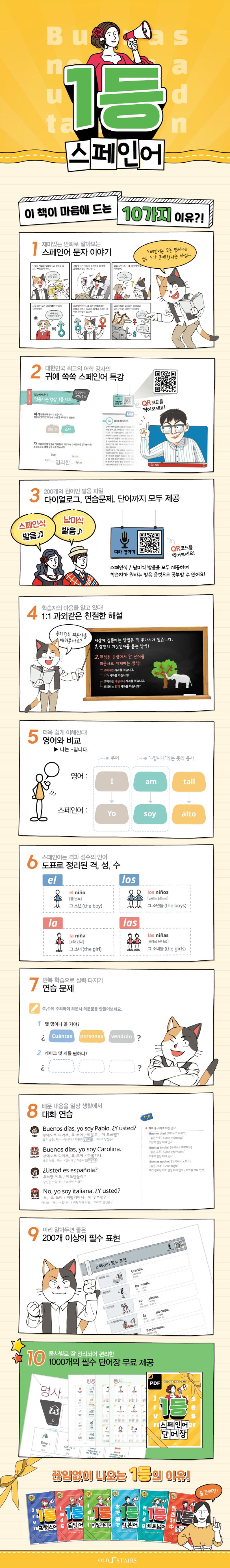 「1등 스페인어」는 스페인어를 완전히 처음 접하는 사람도 단 한 권으로 충분히 독학이 가능하도록 만들어진 교재다. 이 책은 문법부터 회화까지, 하나의 언어를 구사하기 위해 필요한 핵심 요소들을 체계적으로 담고 있다. 그러면서도 의사소통과 관계없이 난이도만 급격하게 올리는 군더더기는 배제하였다.