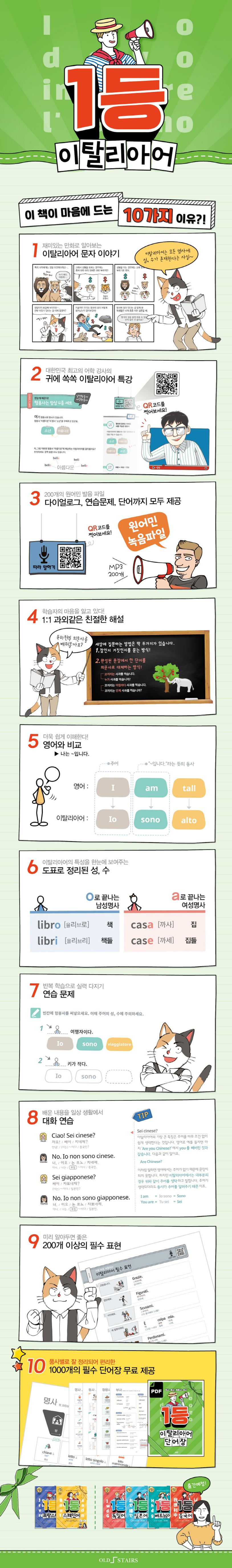 「1등 이탈리아어」는 이탈리아어를 완전히 처음 접하는 사람도 단 한 권으로 충분히 독학이 가능하도록 만들어진 교재다. 이 책은 문법부터 회화까지, 하나의 언어를 구사하기 위해 필요한 핵심 요소들을 체계적으로 담고 있다. 그러면서도 의사소통과 관계없이 난이도만 급격하게 올리는 군더더기는 배제하였다.