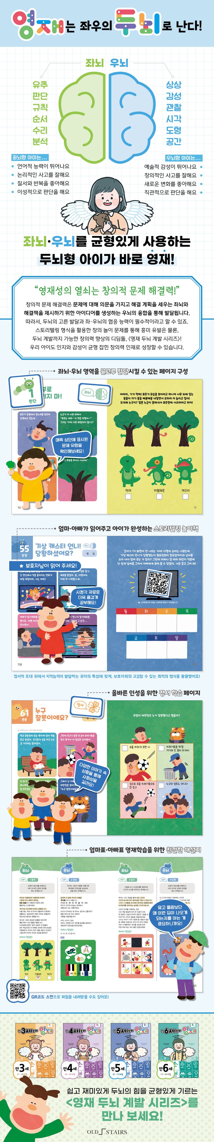 뇌의 기초 공사가 이루어지는 ‘결정적 시기’인 유아기. 이 골든타임만 잘 이용한다면, 엄마표·아빠표 교육으로도 아이에게 잠재된 영재력을 발현시켜줄 수 있다. 〈만 3세부터 영재〉는 연령별 발달 단계를 고려한, 만 3세 시기에 필요한 두뇌 자극 놀이들을 학습지 형식으로 엮은 통합교육 놀이책이다. 좌뇌와 우뇌, 정서와 인지의 통합적 사고력이 ‘미래형 인재’의 중요한 키워드로 떠오른 만큼, 어느 한 부분이 아닌 모든 영역을 골고루 발달시킬 수 있도록 문제를 구성했으며 엄마·아빠가 읽어주고 아이가 완성하는 ‘스토리텔링 형식’을 이용했다. 의미를 구성하고 확장·이해하는 과정을 통해 두뇌의 기능이 고루 향상되고, 보호자와 교감하며 자존감의 토대인 자아 긍정감도 형성될 수 있도록 만든 형식이다. 또, 기발하고 다양한 ‘오감자극 활동’ 들을 포함해 제한된 아이들의 집중력을 최대한으로 활용할 수 있게끔 만들었다.