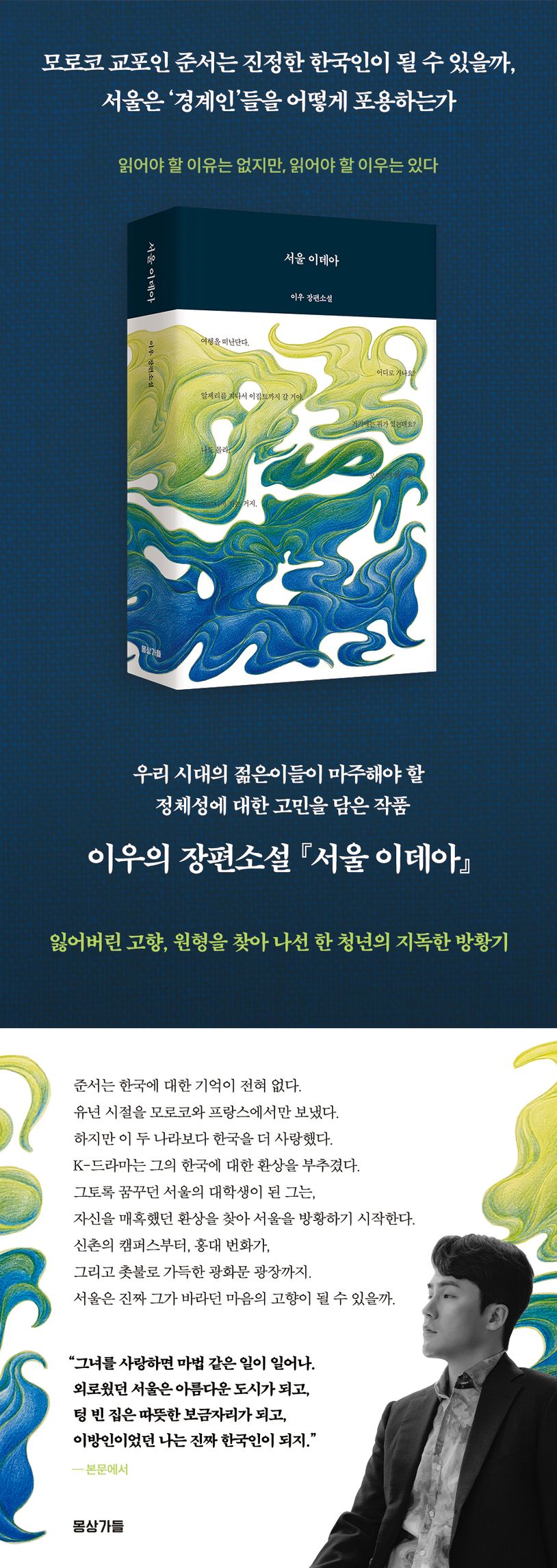 스무 살의 준서는 모로코 교포이다. 그는 유년 시절을 모로코와 프랑스에서만 보냈다. 이곳에서는 모두 준서를 한국인으로 바라봤지만, 정작 그는 한국에 대한 기억이 전혀 없었다. 그는 자신을 한국에서 온 이방인으로 규정하는 시선이 싫었다. 현지인이 되고, 몸 담고 있는 사회의 주류가 되고 싶었다. 그래서 그는 늘 가 본 적도 없는 한국을 자신이 있어야 할 세계라고 생각했다. 그는 K-드라마를 통해 한국을 접하며 한국에 대한 환상을 키워나간다. 마침내 그토록 꿈꾸던 서울의 대학생이 된 그는, 자신을 매혹했던 환상을 찾아 서울을 방황하기 시작한다. 신촌의 캠퍼스부터, 홍대 번화가, 그리고 촛불로 가득한 광화문 광장까지. 서울은 진짜 그가 바라던 마음의 고향이 될 수 있을까.
