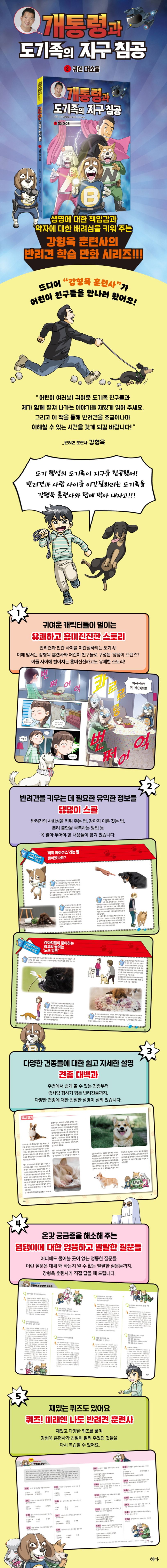 『개통령과 도기족의 지구 침공』은 흥미진진한 스토리와 코믹한 캐릭터들을 통해 어린이 친구들에게 반려견을 키운다는 것의 의미를 재미있게 전달하고 있는 책입니다. 만화 사이사이엔 강형욱 훈련사가 반려견에 대해 친절하게 설명해 주는 다양한 정보들도 빼곡히 담겨 있습니다.