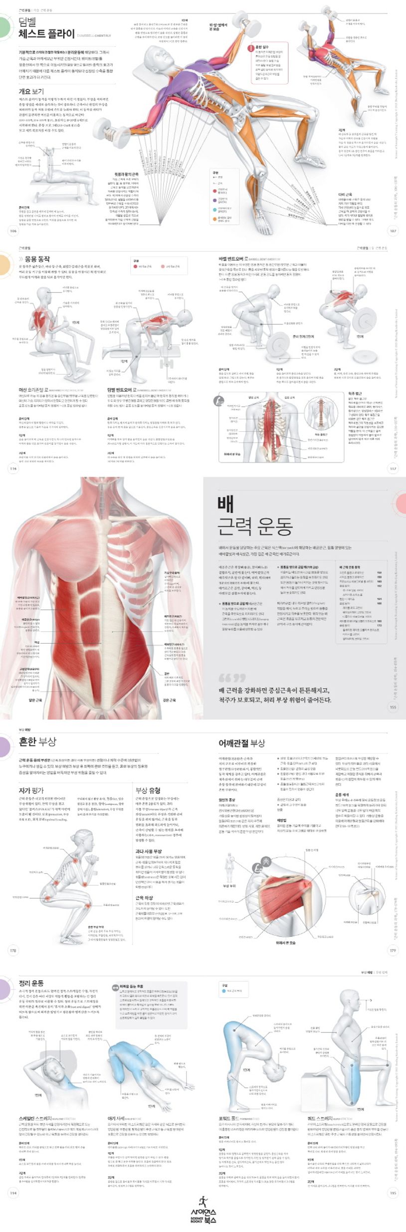 4부로 구성된 이 책은 근력 운동에 숨어 있는 과학을 설명하고 숙련자와 초심자 모두 부상 없이 근력 운동을 제대로 하는 법을 알려 준다. 1부에서는 근육이 어떻게 작동하고 발달하는지, 우리 몸이 근력을 어떻게 일으키는지 설명하고 심신 전반에 걸친 운동의 효과를 살펴본다. 2부에서는 목표 근육군별로 각각의 동작에 이용되는 근육을 보여 주면서 올바른 자세와 기술을 익히고 실수를 피하도록 설명한다. 3부에서는 저항 운동 중 부상을 피하는 방법, 부상 후 운동을 재개하는 방법과 함께 적절한 준비 운동을 포함한 루틴을 다룬다. 4부에서는 효과적인 근력 운동의 응용 동작들에 대해 알아야 할 모든 것을 개괄하며 몇 주, 몇 달, 몇 년 동안 기초부터 숙련도를 다질 수 있는 다양한 프로그램의 예시를 담고 있다.