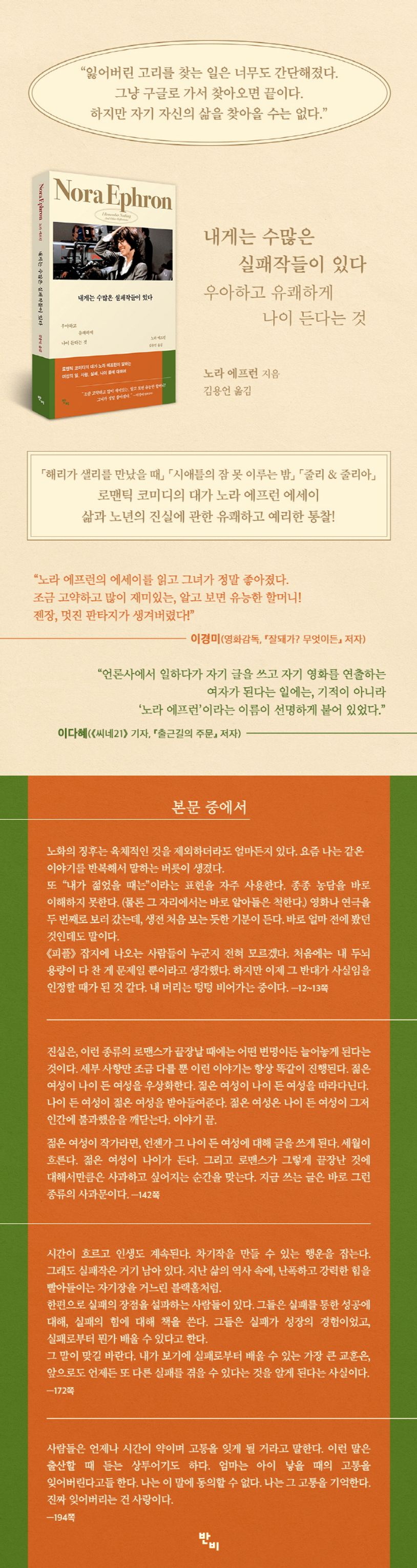 할리우드의 대표적인 여성 감독이자 시나리오 작가로 「해리가 샐리를 만났을 때」 「시애틀의 잠 못 이루는 밤」 「줄리 & 줄리아」 등 고전의 반열에 오른 다수의 영화를 만들어낸 로맨틱 코미디의 대가 노라 에프런이 써낸 생애 마지막 에세이. 고유한 유머 감각과 노골적이리만큼 솔직한 태도, 예리한 감각으로 삶과 노년의 진실에 관한 성찰을 담아낸다. ‘여성의 나이 듦’을 적극적으로 탐색하고 사유하며, 오래 자기 분야를 개척해온, 경험이 풍부한 여성 롤모델이 요구되는 최근의 흐름에 『내게는 수많은 실패작들이 있다』의 목소리는 더없이 시의적절하게 다가온다.