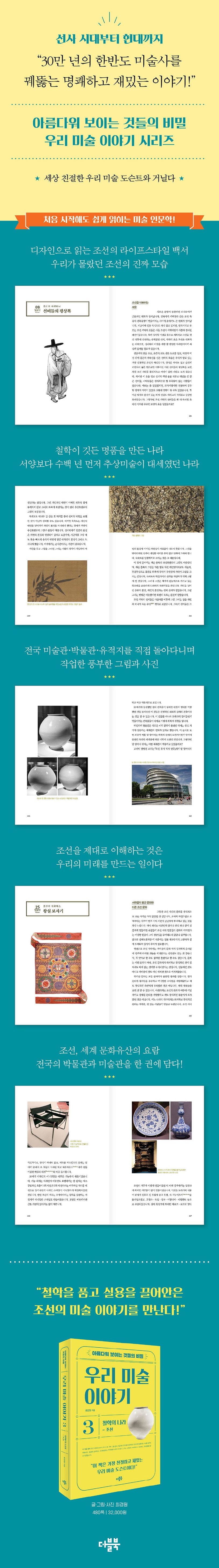 우리 미술이 낯선 이들에게도 쉽게 읽히는 최경원의 미술 인문학 시리즈 《아름다워 보이는 것들의 비밀-우리 미술 이야기》 세 번째 이야기 ‘철학의 나라-조선’ 편은, 무기력하고 고리타분한 나라로 오해되는 조선이 실제로는, 철학이 깃든 명품을 만들고, 서양보다 수백 년 먼저 추상미술이 대세였고, 왕실 물품에서 서민의 일상도구까지 예술의 민주화를 이룬 나라였음을, 서른네 가지 역사적 소재들을 통해 친절하고 재미있게 설명한다. 도자기, 조각, 그림은 물론이고 옷과 가구와 식기를 비롯한 각종 생활용품, 당대의 경제력과 기술 수준을 가늠케 하는 첨단 무기들, 중국·일본과 다른 공간 미학을 품은 건물들까지 골고루 아울러 풍부한 그림·사진까지 곁들인 이 책은, 디자인으로 읽는 조선의 라이프스타일 백서로서, 일상 전반에 광범위한 미술이 함께했던 조선의 진짜 모습을 생생하게 그려 보인다.