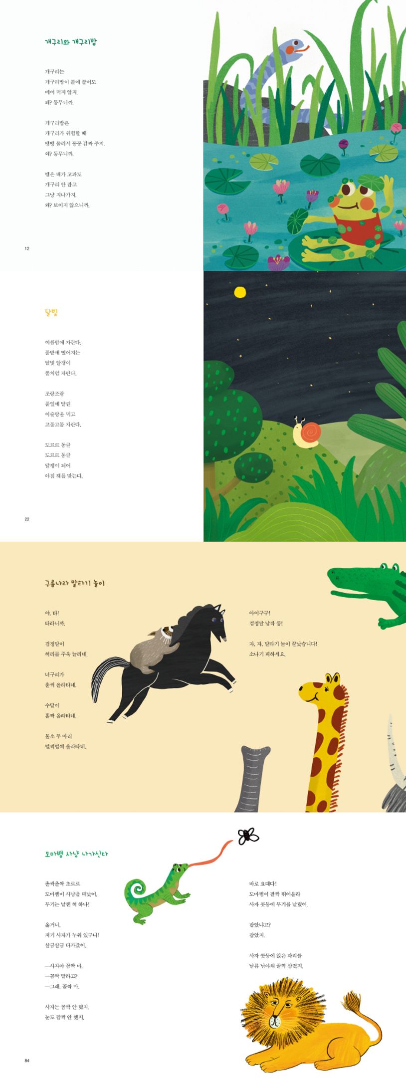 유희윤 시인의 동시집 『도마뱀 사냥 나가신다』에는 귀여운 반전과 위트가 넘쳐 난다. “촐싹촐싹 초르르” 재빠르고 날렵한 움직임과 “날랜 혀 하나”면 도마뱀의 사냥 준비는 충분하다. “사자야 꼼짝 마.”를 외치는 간 큰 도마뱀이 설마 사자를 잡으려는 걸까, 하는 순간 반전이 일어난다. 밀림의 왕인 사자에게 “꼼짝 마.”를 당당하게 외치는 도마뱀이 귀엽기까지 하다. 몸집이 작고 힘이 약한 도마뱀이 사냥감을 노리고 있다가 “바로 요때다!”하며 사자의 콧등에 “무기”를 날리는 장면을 상상해 보라.