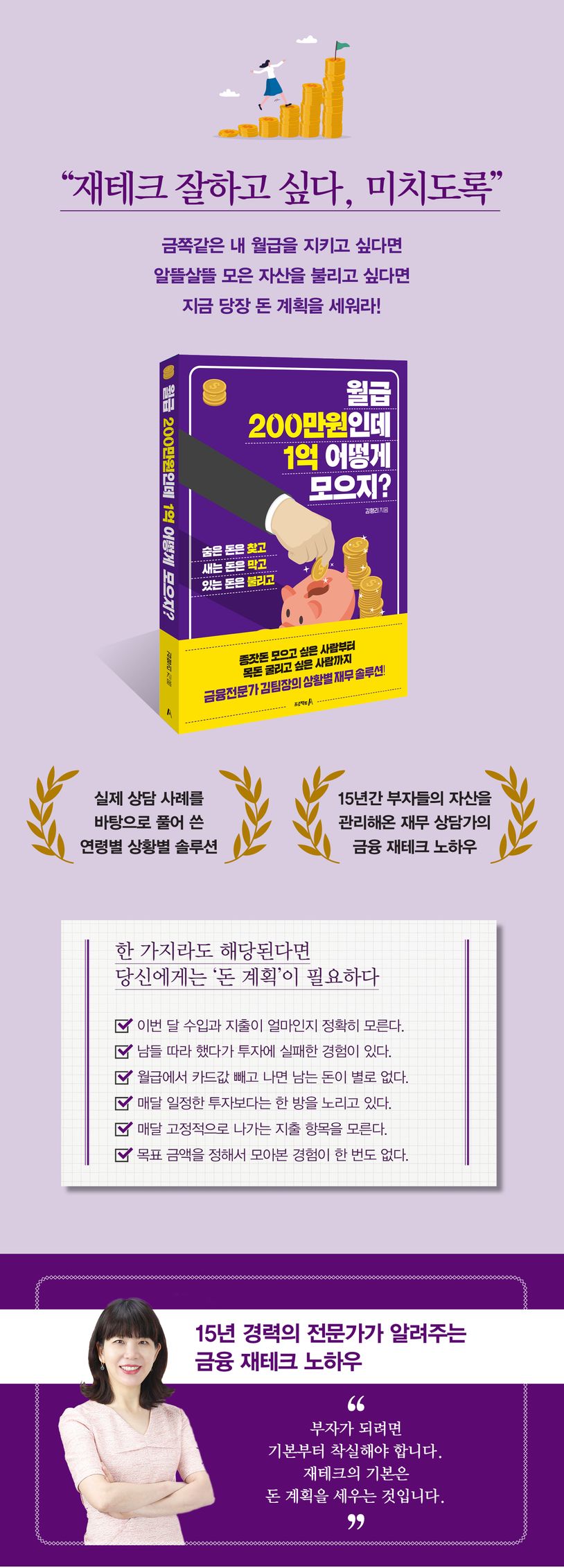 부자가 되고 싶어 하는 사람은 많다. 하지만 반복적이고 시간을 투자해야 재테크 성공률이 높다는 논리를 받아들이기보다는 대부분 짧은 기간 동안 많은 돈을 벌고 싶어 한다. 재테크의 우선은 재무 설계다. 연령별 상황별로 재무 설계가 필요하다. 억대 자산가만 재무 설계를 할 수 있는 것은 아니다. 매달 100만 원이라도 고정적 수익이 있다면 목표 금액을 정하고 돈 계획을 세워 꾸준히 실행해보자. 이 책에는 실제 재무 상담 사례에 금융 전문가가 짜준 돈 계획이 실려 있다. 스스로 돈 계획을 세워 차곡차곡 자산을 불리는 데 도움을 얻을 수 있을 것이다.