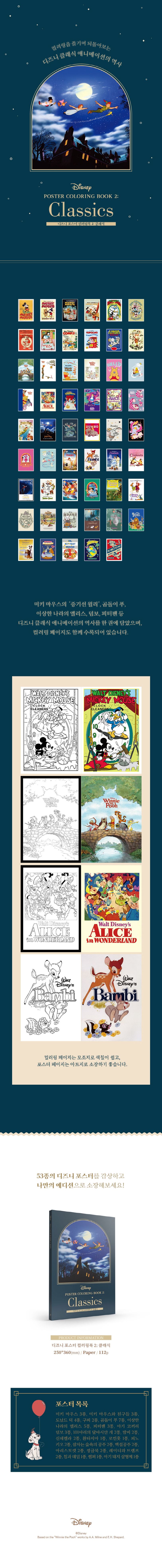 디즈니 대표 캐릭터인 미키마우스의 쇼트 필름 ‘증기선 윌리’ 포스터를 비롯하여 곰돌이 푸, 이상한 나라의 앨리스, 덤보, 피터팬 등등 디즈니 클래식 애니메이션의 역사를 한 권에 담았으며, 포스터를 색칠할 수 있는 ‘컬러링 페이지’도 함께 수록되어 있습니다.