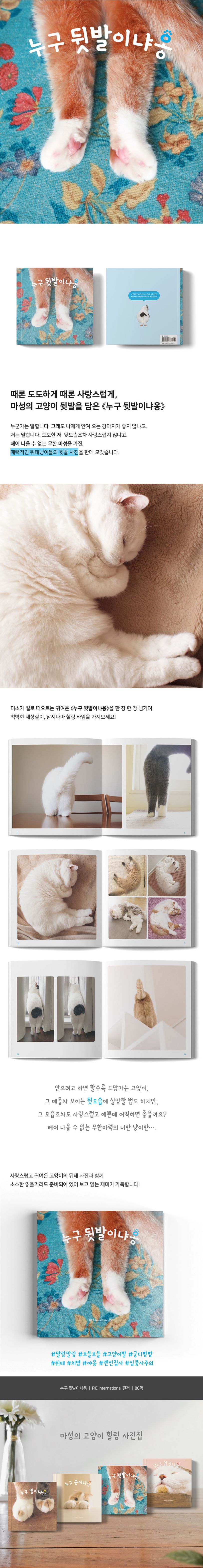 마성의 고양이 힐링 사진집 3권. 잡힐 듯 말 듯 떠나버리는, 그럼에도 헤어 나올 수 없는 너란 냥이란…. 당신의 마음에 행복을 선사해줄, 각양각색 고양이들의 귀엽고 사랑스러운 뒷발 사진을 한데 모은 《누구 뒷발이냐옹》이 출간되었다.