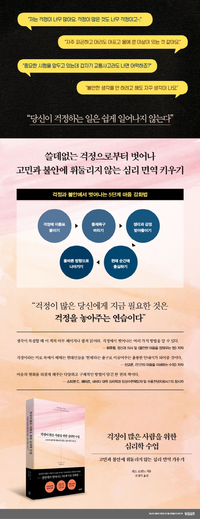 이 책에서는 다양한 인물의 걱정을 담고 있다. 결혼을 앞두고 있을 때, 졸업시험이 코앞에 닥쳤을 때, 몸이 아플 때, 가족과 여행을 마치고 집에 돌아가는 길에, 사고 싶은 것과 사야할 것이 고민될 때 등 우리의 일상에서 떼려야 뗄 수 없는 이야기에 깊이 공감할 것이다. 저자는 걱정을 덜어내는 핵심 방법으로 수용전념치료를 제안한다. 이는 부정적인 감정과 생각을 내 뜻대로 바꾸려고 노력하는 일을 멈추고, 자연스럽게 받아들여 한 발짝 물러서서 파악하는 것이다. 불안에서 벗어나는 5단계 마음 강화법을 따라가다 보면 어느새 걱정과의 힘겨루기를 멈추고 내 삶에 더욱 집중할 용기를 얻게 될 것이다.