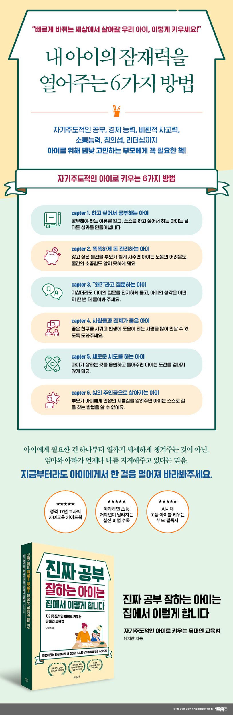 아이를 잘 키우고 하나라도 더 해주고 싶은 부모들을 위한 책이다. 내 아이가 대접받았으면 좋겠고, 혼자서 공부도 잘해줬으면 좋겠고, 번듯한 직장을 가지고 당당하게 살아갔으면 좋겠는 마음을 가진 모든 부모에게 필요한 책이다. 아이들이 미래에 자신의 뜻을 마음껏 펼치며 살 수 있도록 도와주는 6가지 교육법을 담았다. 이 책이 설명하는 것을 따라하다 보면 자기주도적으로 공부를 하고, 돈을 건강하게 모으고 사용할 줄 알고, 질문하고 답을 알아가는 과정에서 비판적이고 창의적으로 생각하며, 사람들과의 관계가 원만하고, 사람들을 이끄는 매력을 가진 아이로 키울 수 있게 될 것이다.