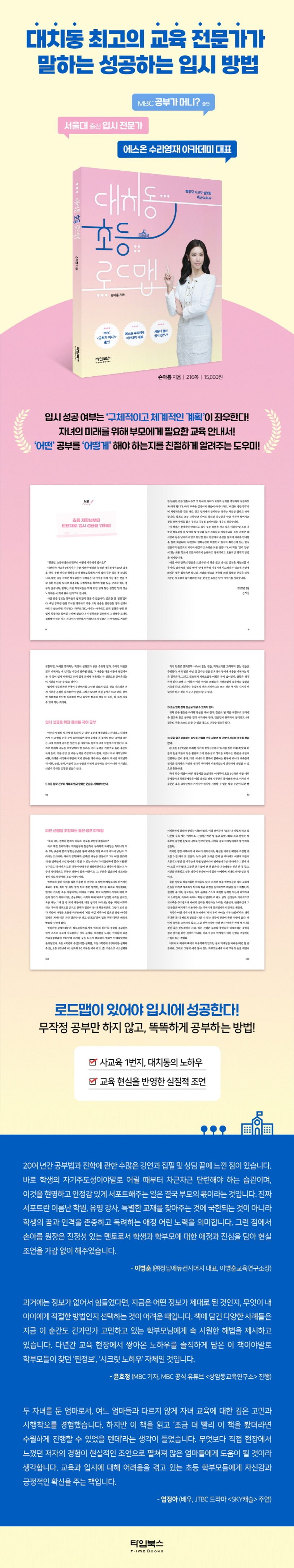 이 책은 ‘대한민국 사교육 1번지’ 대치동에서 입시 전문가로 10여년 간 노하우를 쌓은 저자의 생생한 현장 경험이 고스란히 담겨 있습니다. 치열한 경쟁의 한복판에서 자녀가 성공적인 학업성취를 이루기 위해 학부모들이 어떤 고민과 시행착오, 성공 경험을 했는지 구체적 사례를 들어 보여 줍니다. 입시를 위한 로드맵은 개인에 따라 철저히 개별 맞춤화해야 하므로, 성공 로드맵이라는 것은 구전으로만 떠돌 뿐 실체를 명확히 보기는 사실 어렵습니다. 저자는 탄탄한 입시 내공과 학생 및 학부모 컨설팅을 통해 축적된 노하우를 응집해 학부모의 눈높이에 맞춰 현실적인 로드맵을 조언하고 자녀에게 바로 적용할 수 있는 공부법을 제시하고 있습니다. 또한 소중한 내 자녀의 성장과정과 학년 진급에 따른 학업성취를 그저 양육과 교육의 연습용으로 허비해버릴 수 없는 절체절명의 골든타임에 있는 초등 저학년 학부모들에게 실전 가이드가 되어 줍니다. 장기적인 안목으로 입시 성공 플랜을 구상하고, 자녀와 학부모에게 가장 경제적이고 효율적인 최적의 방법을 찾도록 도와줄 것입니다.