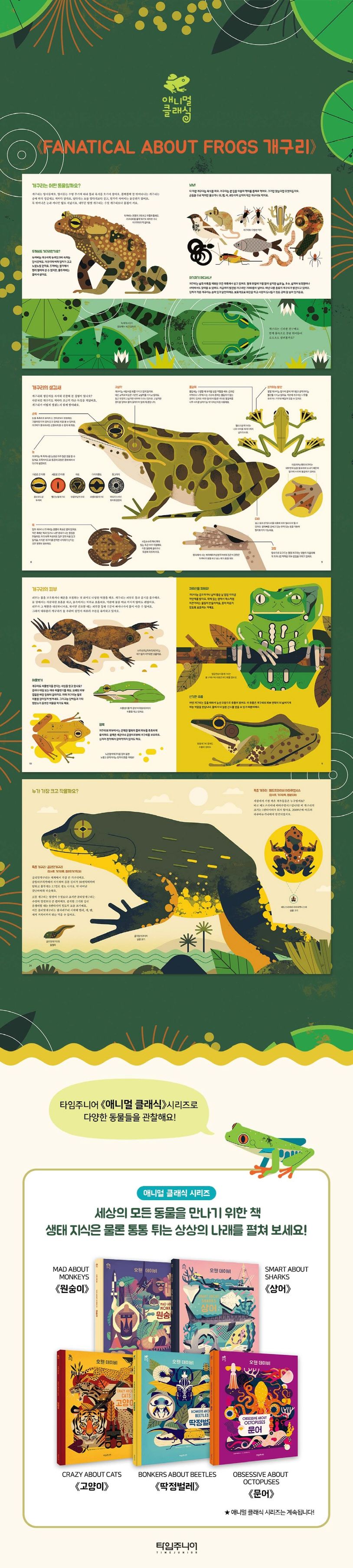 애니멀 클래식 06 《FANATICAL ABOUT FROGS 개구리?는 산과 들 그리고 강에서 만나볼 수 있는 개구리에 대한 이야기가 담겨 있어요. 우리가 알고 있던 개구리보다 훨씬 다양한 종류의 개구리들을 만나볼 수 있지요. 개구리는 양서류에 속해요. 물과 육지를 오가며 살고, 종마다 생김새가 다 달라요. 개구리는 보통 뒷다리는 앞다리보다 길고, 발가락 사이에는 물속에서 헤엄을 칠 수 있게끔 물갈퀴가 있어요.