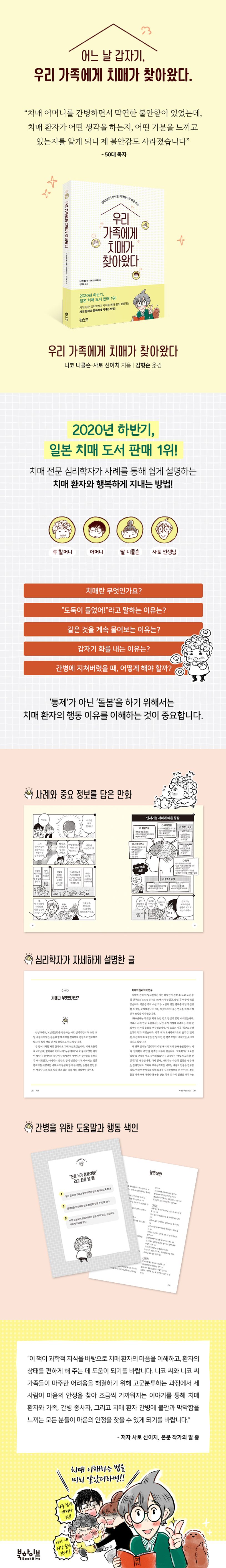 이 책은 치매 가족을 돌본 경험이 있는 두 저자가 자신의 경험과 이를 설명하는 전문 지식을 소개합니다. 특히 환자가 겪는 어려움을 ‘환자의 관점’에서 알 수 있도록 돕고, 이를 통해 궁극적으로 환자의 마음을 이해할 수 있도록 합니다. 행동을 이해하면 그에 따른 적절한 돌봄을 할 수 있게 되어 간병이 쉬워질 수 있습니다.