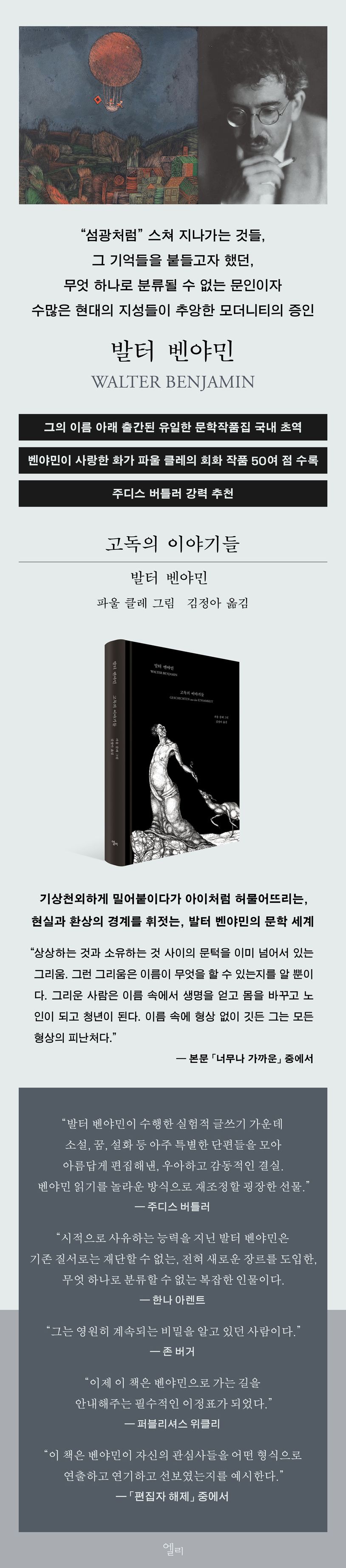 발터벤야민의소설,꿈기록,설화등을처음으로한데모은문학작품집『고독의이야기들』이한국어로번역출간되었다.언어철학,매체이론,문예비평등으로인해상대적으로덜알려졌지만,벤야민은사는내내소설,꿈,설화,우화,비유담,수수께끼같은문학작품들을썼다.그벤야민사상에대해누구보다조예가깊은미국철학자주디스버틀러는이책을두고“벤야민읽기를놀라운방식으로재조정할굉장한선물”이라고말하기도했다.