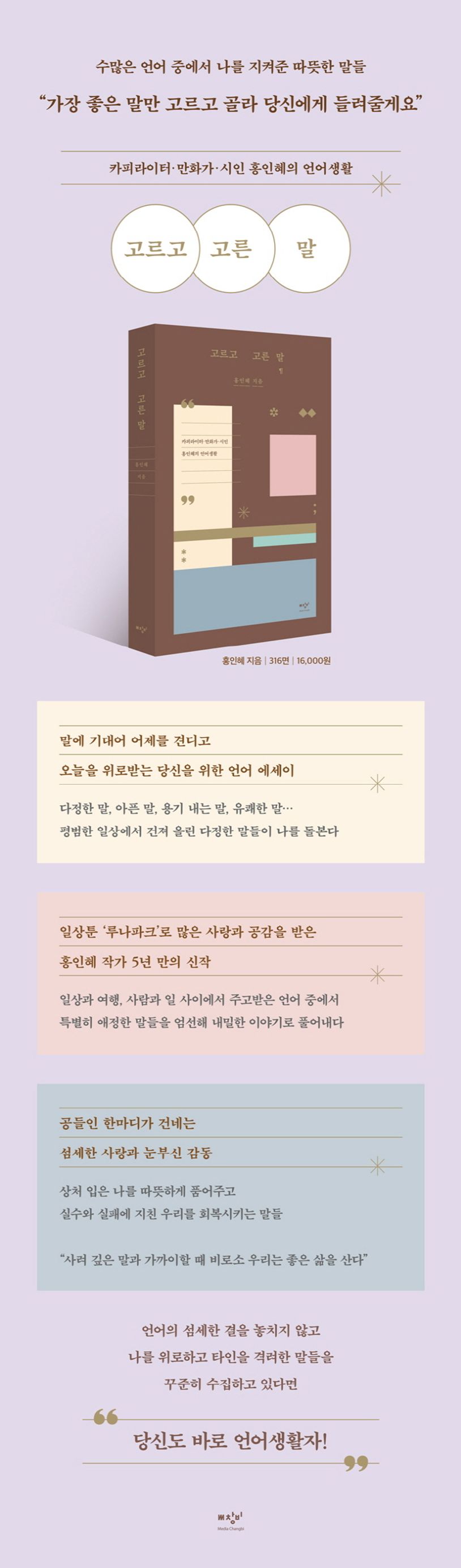 수많은 말 중에서 가장 좋은 말만 고르고 골라 이야기를 전하고자 성실히 노력해온 카피라이터, 만화가, 시인 홍인혜의 언어 에세이 『고르고 고른 말』이 미디어창비에서 출간되었다. 국민일보와 한겨레신문에 연재해온 칼럼에 새롭게 글을 보탠 이 책은 정곡을 찌르는 메시지와 빈틈을 파고드는 유머로 말에 대한 이야기를 펼친다. 일상툰 ‘루나파크’로 독자들과 끈끈한 공감대를 형성해온 홍인혜는 말의 세계가 늘 궁금했다. 작은 태양계처럼 말의 인력에 이끌린 듯 그 주변을 빙글빙글 돌면서 광고를 만들고, 만화 속 말풍선을 채우고, 다양한 곳에서 강연하다가 2018년에는 시인으로 등단했다. 날마다 말을 닦고 기름칠하다가 마침내 말이 취미이자 특기이고 놀이이자 밥벌이인 언어생활자가 된 것이다.