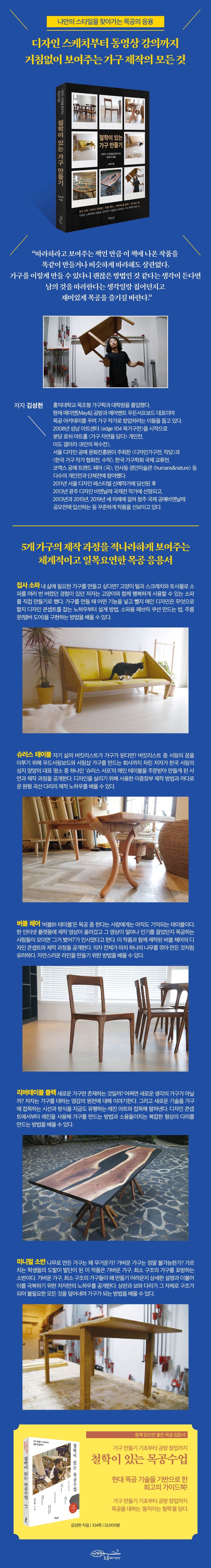 현대 목공 기술을 기반으로 목공에 임하는 ‘움직이는 철학’을 담아 목공의 기초부터 공방 창업까지 총망라한 목공 입문서 〈철학이 있는 목공 수업〉의 후속작이다.