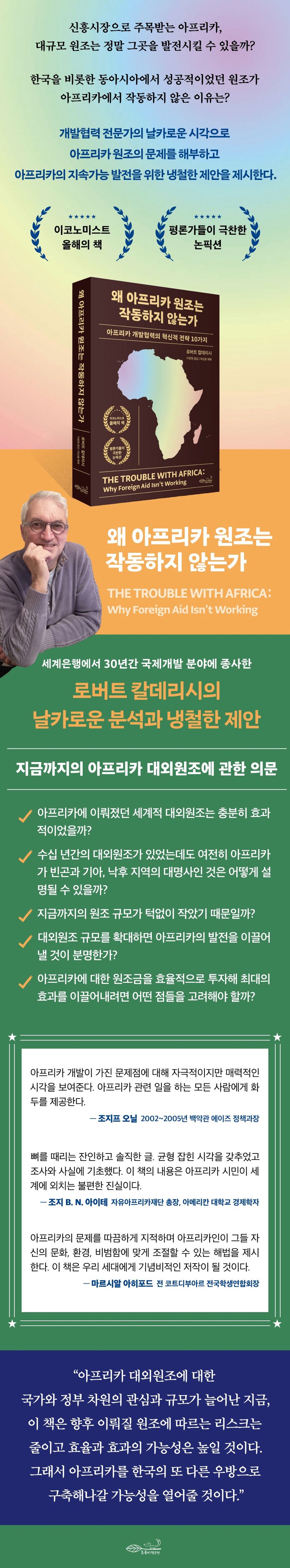 이 책은 세계의 대표적 국제개발협력 기구인 세계은행에서 아프리카 담당자로 오래 일한 로버트 칼데리시가 아프리카 대외원조에 대한 오해와 진실을 예리하게 파헤치고 앞으로의 아프리카 개발협력에서 반드시 고려해야 할 점들을 제안한 책이다. 아프리카를 제대로 파악하지 않은 상황에서 이루어지는 대외원조는 그곳을 발전시킬 수도, 그곳과 새로운 정치적·경제적 우방의 관계를 맺을 수도 없다. 이런 점에서 이 책은 아프리카와의 관계를 본격적으로 다져나가려는 이 시점에 반드시 탐독해야 할, 나침반과도 같은 책이 될 것이다.