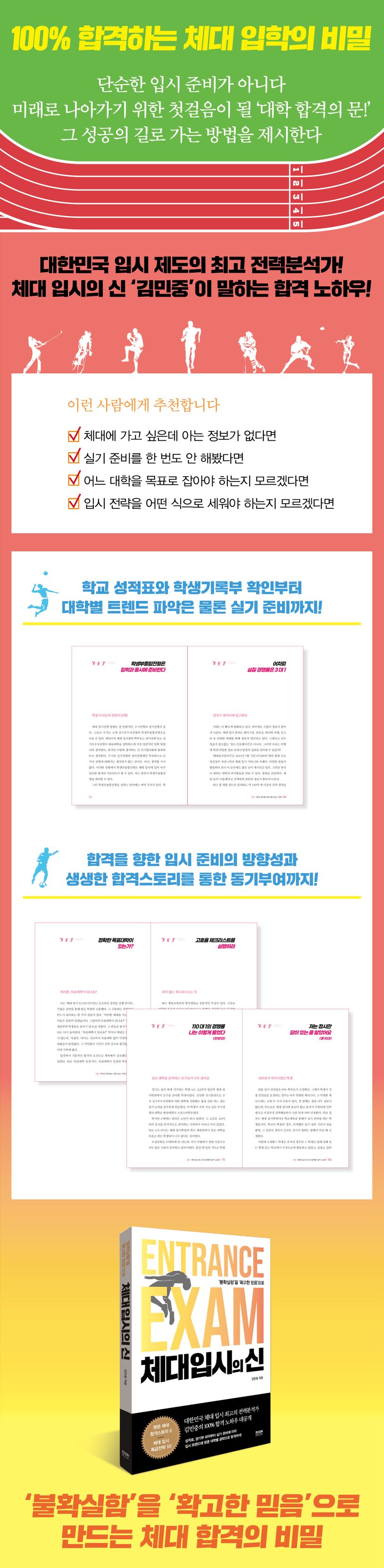 《체대 입시의 신》은 저자가 지난 17년간 1,000명이 넘는 합격생을 만들어 낸 노하우가 낱낱이 담겨 있다. 단순히 대학을 입학하기 위한 입시 준비가 아닌 목표로 하는 체대에 100% 합격하는 방법과 수백 대 1의 경쟁률을 뚫는 전략을 제시한다. 공부를 전혀 안 하던 학생도, 모의고사가 9등급이었던 학생도, 실기 준비를 한 번도 안 해본 학생도 원하는 체대에 갈 수 있다. 대한민국 체대 입시의 전설이자 넘버원 코치가 말해주는 체대 입시생들이 꼭 알아야 하는 합격 노하우 25가지와 매해 새롭게 업데이트되는 대학교별 전력분석법! 이 책을 통해 불가능을 가능으로 만들어주는 입시 전략을 세워 원하는 체대에 꼭 합격하길 바란다.