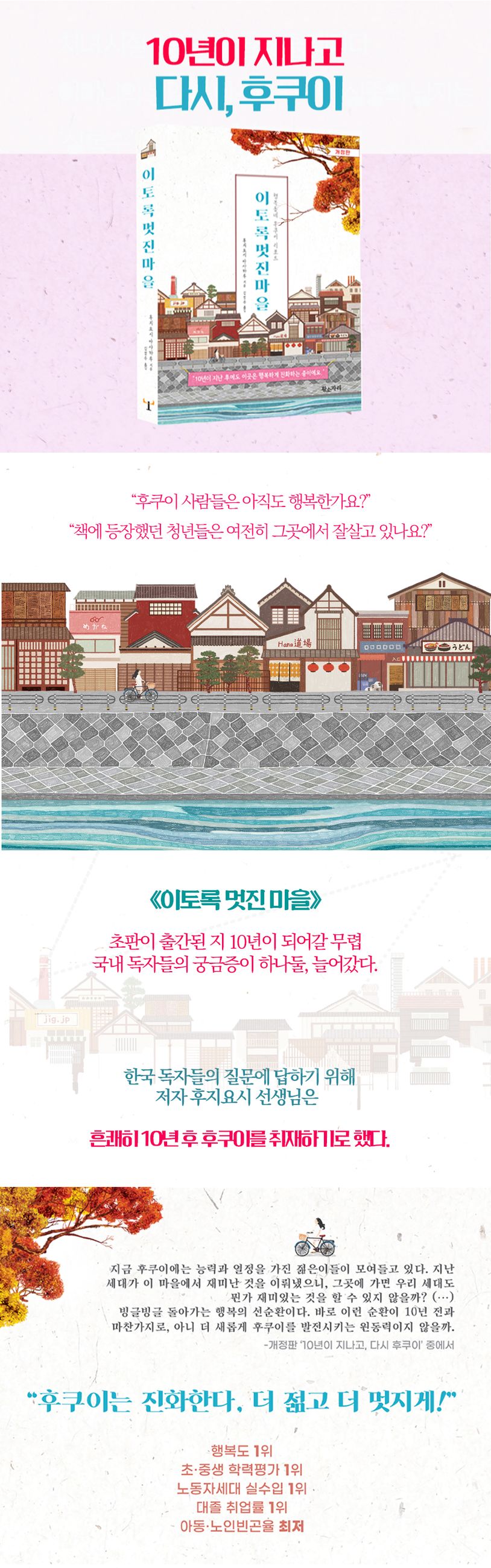 2016년 여름 한국어 번역판이 처음 출간된 이래 이 책은 우리 사회에 적잖은 반향을 일으켰다. 그리고 지난해부터 후쿠이 사람들은 여전히 행복한지, 책에 등장했던 젊은이들은 지금 어떻게 사는지 궁금하다는 질문이 출판사에 들어오기 시작했다. 한국 독자들의 요청을 전해 들은 저자는 흔쾌히 ‘10년이 지난 현재 그곳 후쿠이’를 취재했고, 다시 한번 멋지게 도약하는 후쿠이 사람들의 2025년 이야기를 담아 이번 한국어판 개정판에 수록했다.