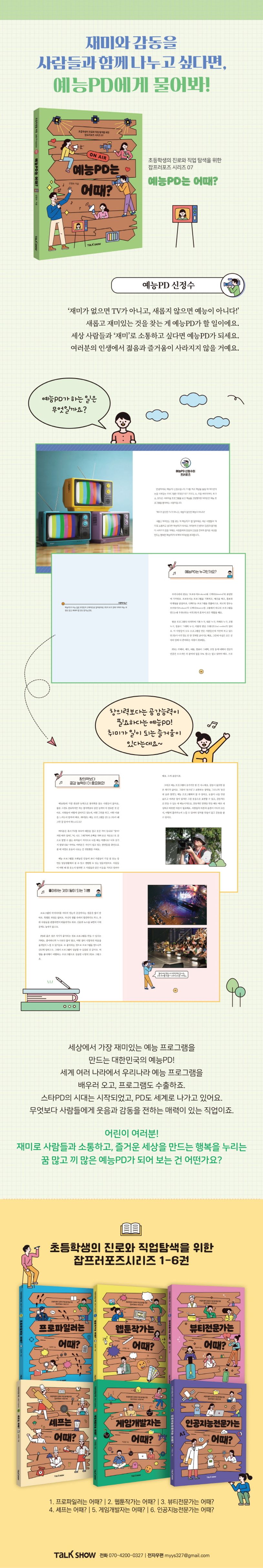 예능PD는 이렇게 재미와 감동이 있는 예능 프로그램을 만드는 일을 하는 직업이에요. 예능PD가 하는 일이 구체적으로 무엇인지, 어떤 자질이 필요한지, 어려서는 어떤 준비를 하면 좋은지 알고 싶다면, 25년차 예능PD로 일하고 있는 신정수 PD의 이야기를 들어보세요. 어린이가 궁금한 예능PD라는 직업의 세계를 쉽고 자세하게 알려드립니다.