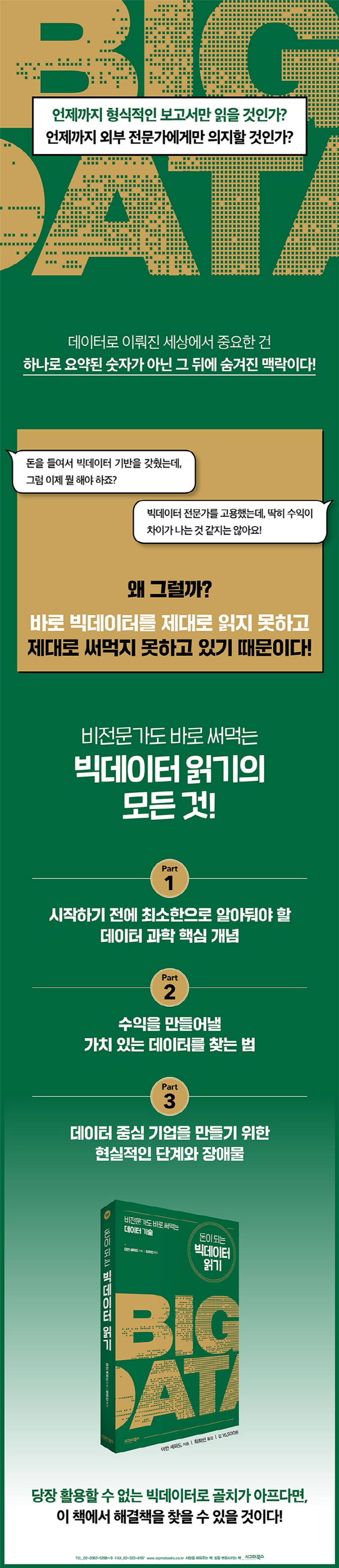 중요한 건 기업의 규모가 크든 작든, 자신이 큰 기업을 운영하든 동네의 옷가게를 운영하든 데이터가 필수인 시대에 살고 있다는 것이다. 이런 세상에서는 전문가가 아니라도 데이터를 써먹을 수 있는, 혹은 전문가를 고용해도 그들이 무엇을 하는지 바로바로 이해할 수 있는 빅데이터 활용법을 알고 있어야 한다. 이 책은 빅데이터 세계를 헤매는 그런 이들을 위한 것이다.
