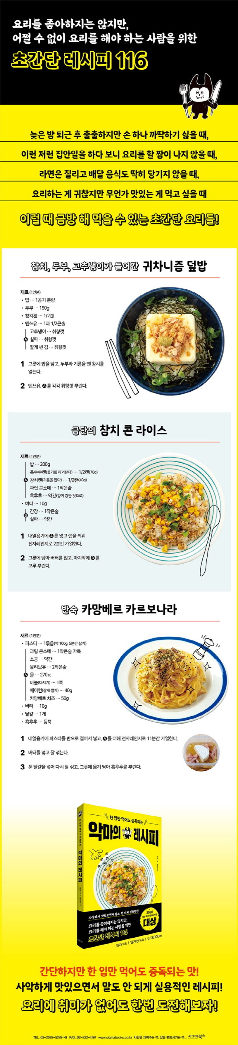 제7회 일본 요리 레시피 서적 대상 요리 부문 대상을 수상한 이 책 안에는 간단한 재료와 조리법으로 뚝딱 만들 수 있는 레시피 116가지가 담겨 있다. 늦은 밤 퇴근 후 배는 고프지만 손 하나 까딱하기 싫을 때, 이런 저런 집안일 처리하다 보니 요리를 할 짬이 나지 않을 때, 요리하는 것을 즐기진 않지만 인스턴트를 먹기엔 그렇고 배달 음식도 딱히 당기지 않을 때 짧은 시간 안에 그럴싸한 요리 한 그릇을 만들어 낼 수 있다. 게다가 중독될 만큼 맛있다! 너무 단순하고도 간단해서 한번 해보고 싶은 레시피다.