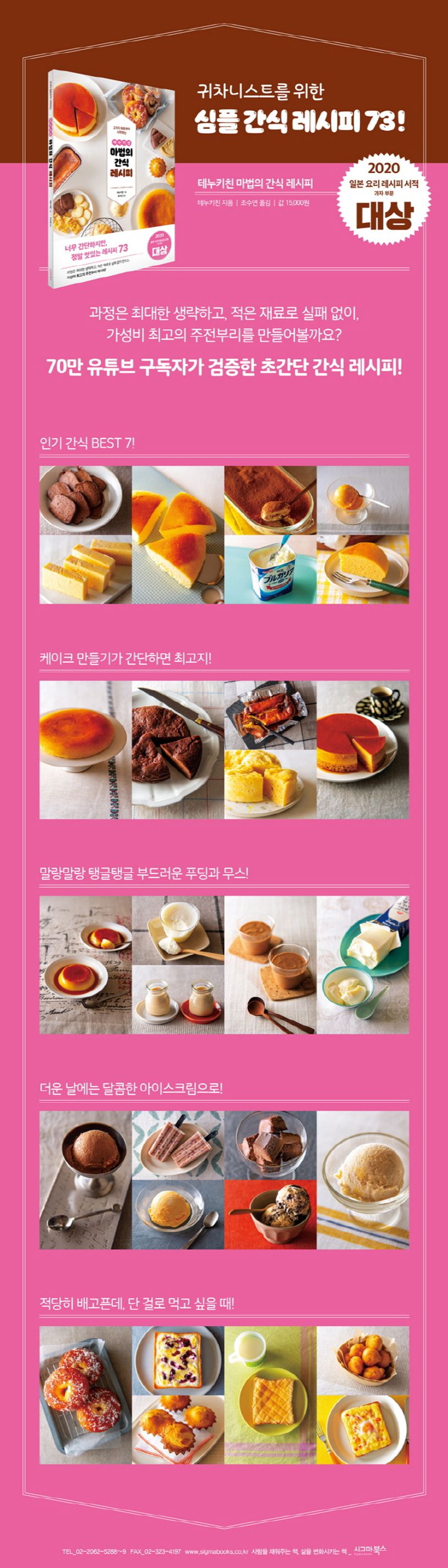 단 2가지 재료로 초콜릿 쿠키를 만들 수 있다면? 달콤한 간식의 재료가 최대 5가지가 전부라면? ‘제7회 일본 요리 레시피 서적 대상’ 과자 부문 대상을 수상한 이 책에는 ‘적은 재료로 최소한의 과정으로 만드는’ 간식 레시피 73개가 소개되어 있다. 저자가 운영하는 ‘테누키친(/Tenu Kitchen)’ 유튜브에서 조회수 100만을 넘긴 인기 레시피를 엄선했다. 재료는 최대 5개, 전자레인지와 오븐토스터로 대충 섞어도 맛있어지는 마법 같은 간식 레시피를 만나보자!