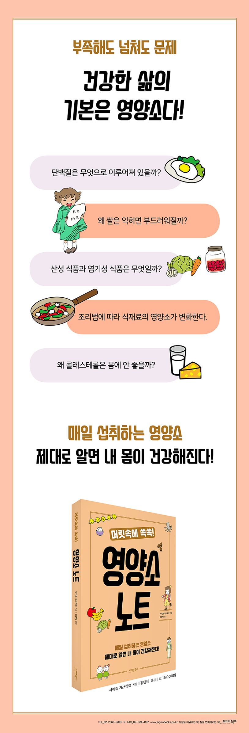 동서고금을 막론한 잔소리, “골고루 잘 먹어라”가 왜 진리인지를 과학적으로 밝힌 책이다. 과학적이라고 해서 겁먹을 필요는 없다. 일상생활 속에서 한 번쯤은 가졌을 만한 의문점을 소주제로 삼았고, 그림으로 쉽고 재미있게 영양소의 원리를 설명했다. 가벼운 마음으로 읽다 보면 영양소에 관한 오해와 의문을 해소하고, 더 즐겁고 건강한 식사를 위한 영양소 지식이 쌓이게 된다.