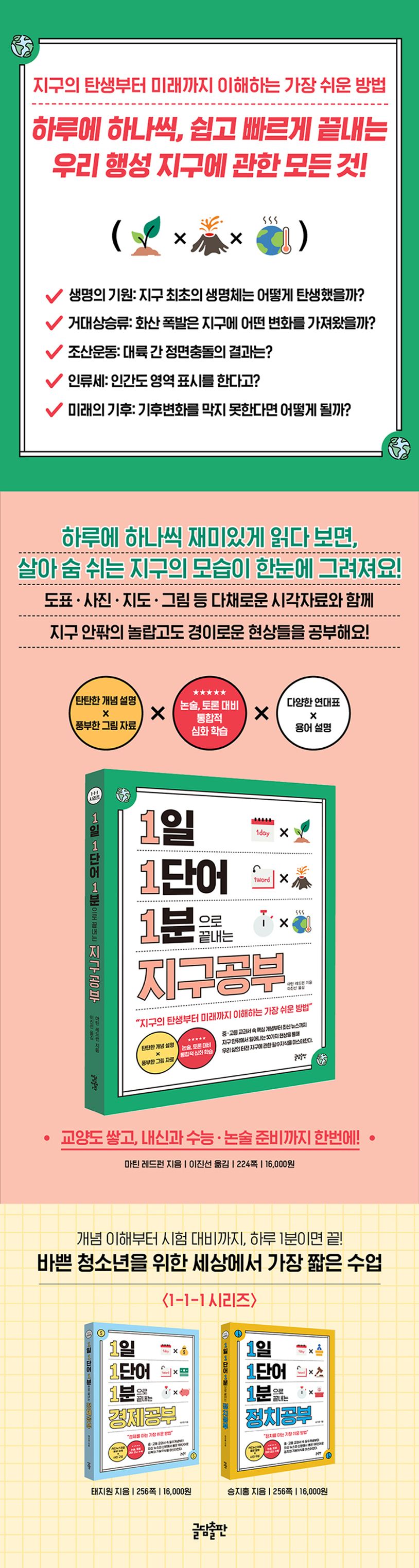 중ㆍ고등 교과서 속 필수개념은 물론 뉴스와 신문 속 최신 이슈를 통해 핵심개념을 가려 뽑고 이해를 도울 다양한 자료를 더해 가장 빠르고 정확하게 필수지식을 익히도록 돕는 1ㆍ1ㆍ1 시리즈. 이 책은 출간 이후 독자들의 많은 사랑을 받아온 『1일 1단어 1분으로 끝내는 경제공부』, 『1일 1단어 1분으로 끝내는 정치공부』의 뒤를 잇는 세 번째 책으로, 이번에는 우리 삶의 터전인 ‘지구’에 대한 모든 것을 공부한다. 영국 BBC 과학 분야 프로듀서이자 영국과학작가협회로부터 세 차례에 걸쳐 과학작가상을 수상한 과학 저널리스트 마틴 레드펀이 지구 가장 깊은 안쪽부터 그 바깥의 우주까지, 지구 탄생부터 미래까지를 50가지 현상을 통해 친절하게 안내한다.
